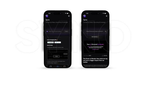 🚀 Introducing Syno, the game-changing YouTube summarizer app! ✨ Designed using Flutter and backed by the powerful GPT-3.5-turbo API, Syno is here to transform the way you consume video content. Say goodbye to lengthy videos and hello to concise, accurate summaries that capture the essence of each video. Experience the future of video summarization with Syno🎉