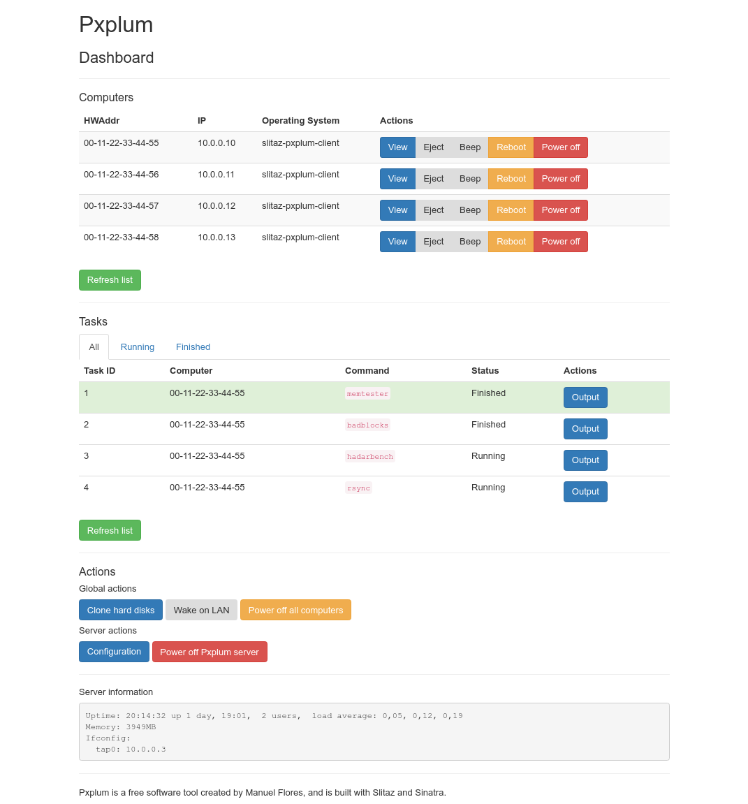 Pxplum consiste en una herramienta basada en una distribución ligera de GNU/Linux a distribuir como live-cd con opción a ser instalada, que permite arrancar los equipos de una red a través de PXE y controlarlos mediante una interfaz web.
