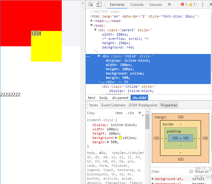 - border-box(IE盒模型), width和height包含了padding和border,但不不含margin。上面展示的child实际渲染的宽高为220 * 120,多了margin的宽高